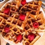 These crispy waffles get their sweetness from bananas and raspberries. The Easy Vegan Protein Waffles are fluffy inside and keep you full.